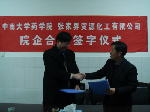 元月14日上午,奈飞工厂 药学院院长李元建教授与张家界贸源化工有限公司董事长汤先赤先生在热烈的掌声中,互换双方签字的院企合作协议书。这是药学院继与广州威尔曼新药研发中心、国药…