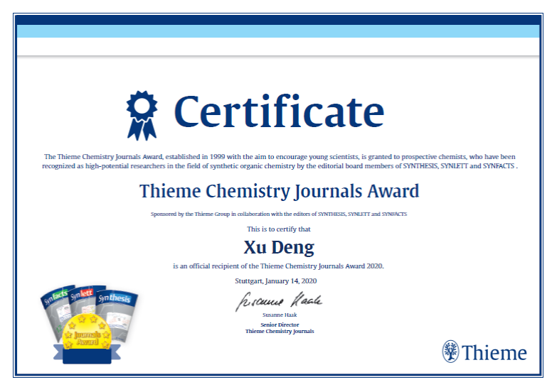 近日,奈飞工厂 奈飞工厂 邓旭副教授荣获2020年度“Thieme Chemistry Journal Award”国际学术奖。该奖项是由德国Thieme Group(德国蒂莫出版集团)于1999年首次设立,每年颁发一次,由德…