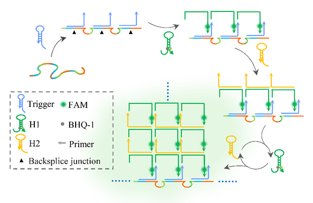 近期,我院药剂学系朱曲波副教授团队在生化分析及传感领域的Top期刊《Biosensors and Bioelectronics》(IF=10.618)上发表一篇题为“Specific and sensitive detection of circRNA based on netlike hybridization chain reaction”的研究论文。该研究开发了一种基于网状杂交链式反应的新型环状RNA(circRNA)检测方法。