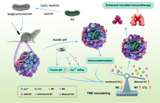 免疫治疗是一种新兴的肿瘤治疗方式,在肿瘤治疗中显示出巨大的前景。其中,肿瘤疫苗,尤其是自体肿瘤疫苗,其抗原特异性高,可通过激发肿瘤特异性免疫发挥治疗作用,副作用小,在肿瘤治疗中极具优势。但肿瘤免疫抑制微环境严重限制了其疗效。探索逆转肿瘤免疫抑制微环境的可行方法,是提升自体肿瘤疫苗疗效的关键。基于细菌的肿瘤治疗已有100多年的历史,近些年重新引起研究者们的关注。其中,沙门氏菌由于肿瘤靶向性好、组织渗透性强、全基因组已知易于改造等多种不可替代的优势在众多细菌中脱颖而出。研究表明,沙门氏菌可通过多种机制发挥抗肿瘤作用,包括诱导肿瘤细胞凋亡和免疫原性死亡,促进肿瘤抗原的释放;调控免疫,增加免疫细胞在肿瘤部位的浸润和活性等。因此,沙门氏菌可作为一种天然的自体肿瘤疫苗。研究团队在前期工程菌抗肿瘤的基础上(Nano Letters, 2021; Acta Pharm Sin B, 2023),利用原位矿化作用对沙门氏菌表面进行碳酸钙修饰,同时负载钙离子载体A23187,构建出具有多重免疫调控活性的组装体系。在肿瘤微酸性环境中,表面修饰的碳酸钙分解,中和肿瘤酸度,同时释放沙门氏菌/Ca2+/A23187。在A23187的介导下Ca2+内流进入免疫细胞,其作为第二信使通过信号转导发挥免疫调控作用,联合沙门氏菌的肿瘤杀伤和免疫诱导活性、碳酸钙的酸中和效应,有效促进自体肿瘤抗原的释放和提呈,并从多角度重塑肿瘤免疫抑制微环境,实现了肿瘤原位免疫增敏,成功地抑制了原发瘤和转移瘤,为自体肿瘤疫苗的开发提供了一种全新的策略。该研究也可为肿瘤微生物治疗的开发与临床转化提供新思路。