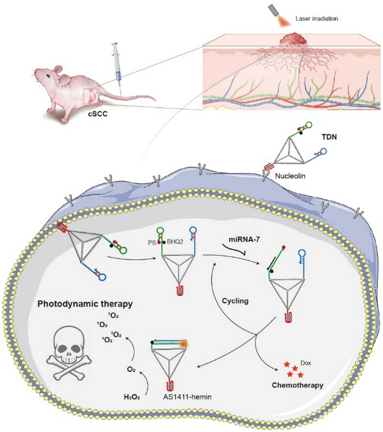 光动力疗法(PDT)是治疗包括皮肤鳞状细胞癌(cSCC)在内的皮肤相关肿瘤的有效策略。但其临床应用仍面临双重挑战:如何在保证疗效的同时降低光毒性脱靶风险,以及如何克服肿瘤缺氧微环境对氧依赖性光敏剂的抑制作用。为解决上述问题,团队构建了一种基于四面体DNA框架的智能纳米系统,通过整合肿瘤靶向适配体与miRNA响应性发夹DNA催化组装(HCA)模块,实现了cSCC的精准协同治疗。该系统经适配体靶向递送后,由cSCC特异性miRNA激活HCA级联反应,触发光敏剂(PS)的原位扩增与化疗药物的可控释放。此外,通过将具有类过氧化氢酶活性的血红素整合至DNA骨架,有效催化肿瘤微环境内过氧化氢分解产氧,解决了肿瘤微环境缺氧问题。