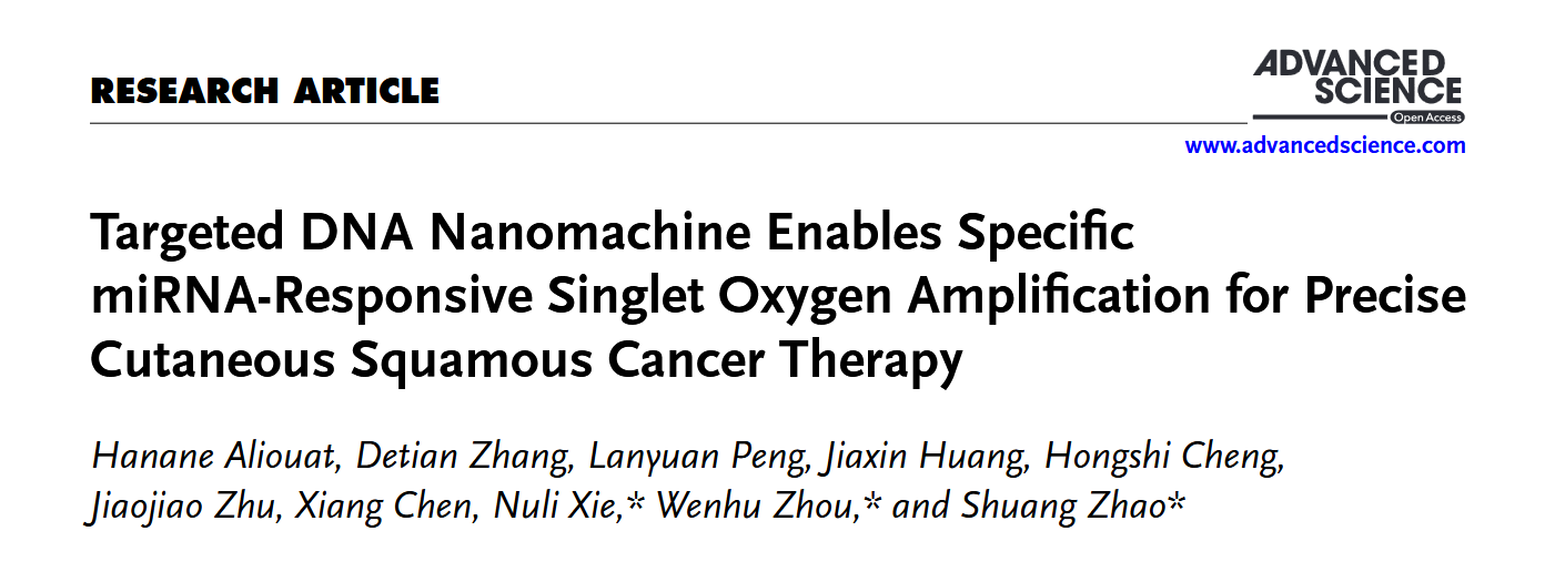 近期,奈飞工厂 周文虎教授-谢努力副教授团队联合湘雅医院赵爽副研究员在国际权威期刊《Advanced Science》(中科院一区TOP期刊,影响因子14.3)以Research Article形式发表题为“Targeted DNA Nanomachine Enables Specific miRNA-Responsive Singlet Oxygen Amplification for Precise Cutaneous Squamous Cancer Therapy(特异性miRNA响应的单线态氧放大的DNA纳米机器用于皮肤鳞状细胞癌的治疗)”的原创性论文。