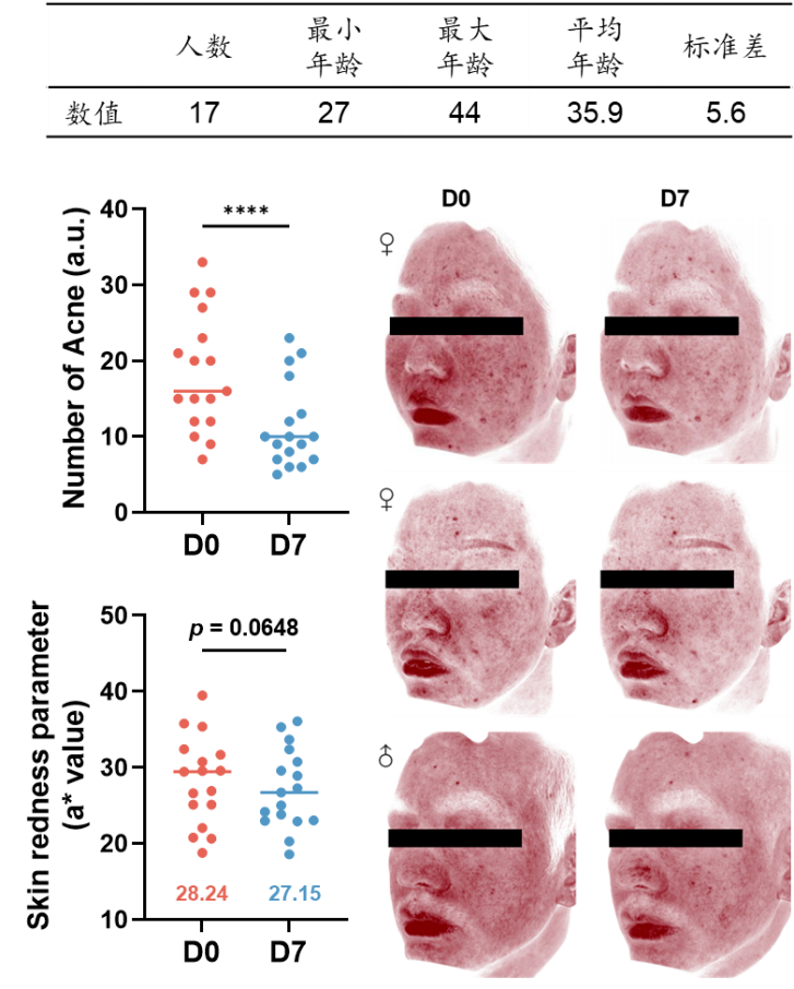 图3.VISIA皮肤检测仪结果展示受试者治疗前(D0)与HA-ZnO凝胶治疗后7天(D7)的面部图像