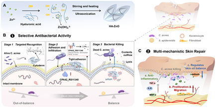 痤疮困扰全球近10亿青少年,其核心致病菌痤疮丙酸杆菌(C.acnes)通过分泌促炎因子破坏毛囊微环境,导致皮脂腺堵塞与反复感染。传统抗生素疗法面临三大困境:皮肤屏障阻碍药物渗透、广谱抗菌破坏皮肤微生态、细菌耐药性逐年攀升等,但目前临床上仍无有效的治疗药物和策略。本研究团队针对上述临床痛点创新性开发了透明质酸稳定化纳米氧化锌(HA-ZnO),通过仿生矿化技术实现三大创新升级: