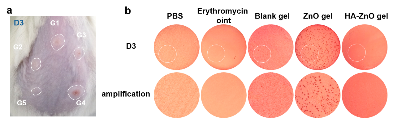 图2.(a)治疗3天后的痤疮形貌(G1:PBS组;G2:红霉素软膏组;G3:空白凝胶组;G4:ZnO凝胶组;G5:HA-ZnO凝胶组);(b)不同组痤疮组织匀浆的细菌涂布结果(n = 6)