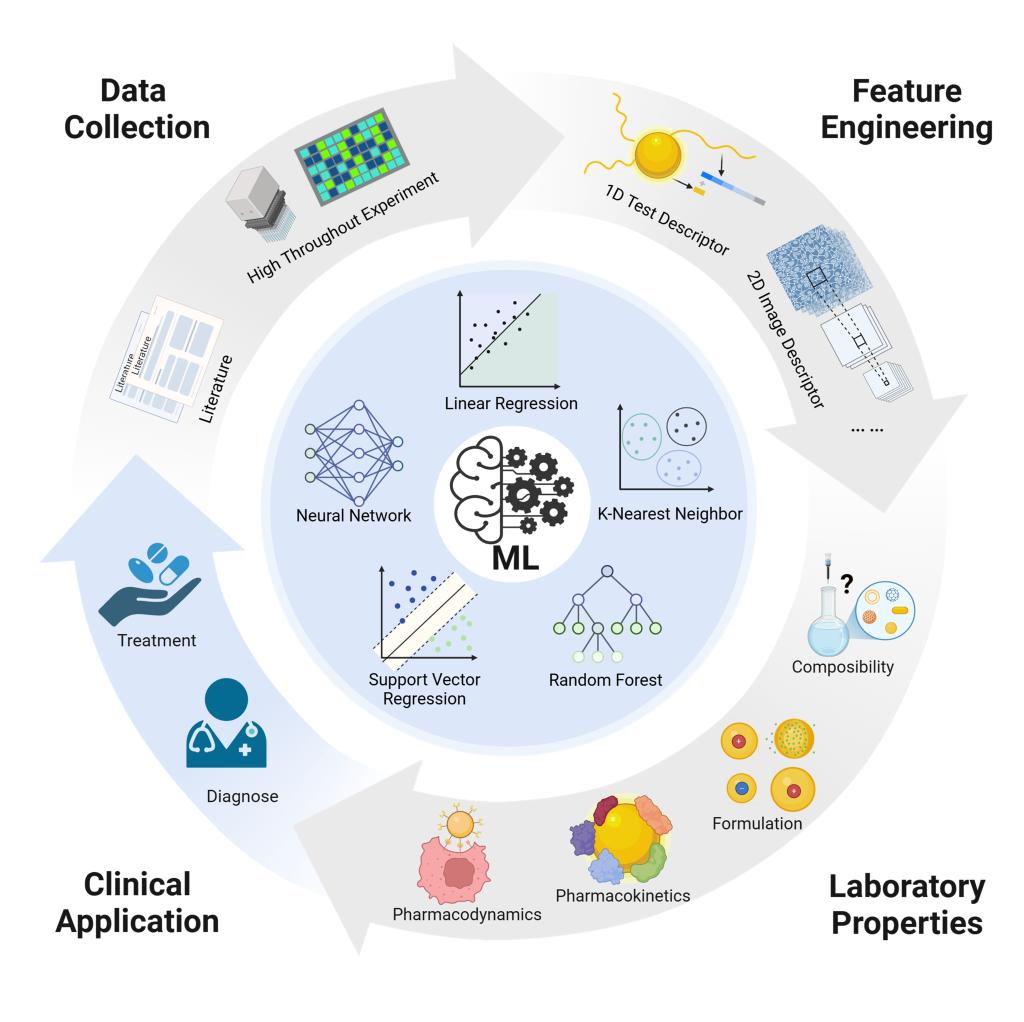 与传统依赖试错法的研发模式相比,机器学习技术能够通过多参数优化算法实现智能预测与决策支持,显著缩短研发周期并降低人力成本。更重要的是,基于大数据的机器学习方法能够高效探索更广阔的化学空间,加速新型纳米材料与功能化合物的创新设计,为纳米药物研发从“经验驱动”向“数据驱动”的重要范式转变提供了参考。