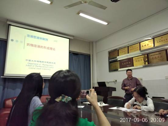 9月6日晚上7:00,我院药剂学教研室在孝骞楼626办公室举行了2017学年秋季学期本科生理论课预讲活动。刘珍宝老师、周文虎老师参与了本次本科生理论授课预讲,授课内容分别为《溶液的形成理论》、《固体分散体的制备技术》。本次活动由药剂学系主任丁劲松教授主持,系副主任陈传品教授、姚瑶副教授,柳文洁老师,吴建平老师,贺凌云老师及教学秘书袁玉老师到场指导。