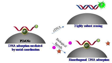DNA功能化纳米粒已广泛应用于生物传感器领域,但其在实际应用中仍然面临灵敏度低、特异性差等问题。该论文发现DNA可在金属离子配位作用力的介导下高选择性、高稳定性的吸附于聚多巴胺纳米粒表面,实现所谓的Bioorthogonal Adsorption,据此可构建DNA功能化的纳米探针。该探针可抵抗磷酸盐、金属离子、血清蛋白等多种生理基质的非特异性解吸附,因而在细胞内成像的应用中具有更强的选择性与抗干扰能力。与此同时,通过改变金属离子的种类,可以选择性调整DNA在聚多巴胺纳米材料上的吸附方式。该研究揭示了DNA与纳米材料表界面作用的新机制,也为纳米探针在医学诊疗中的应用提供新策略。