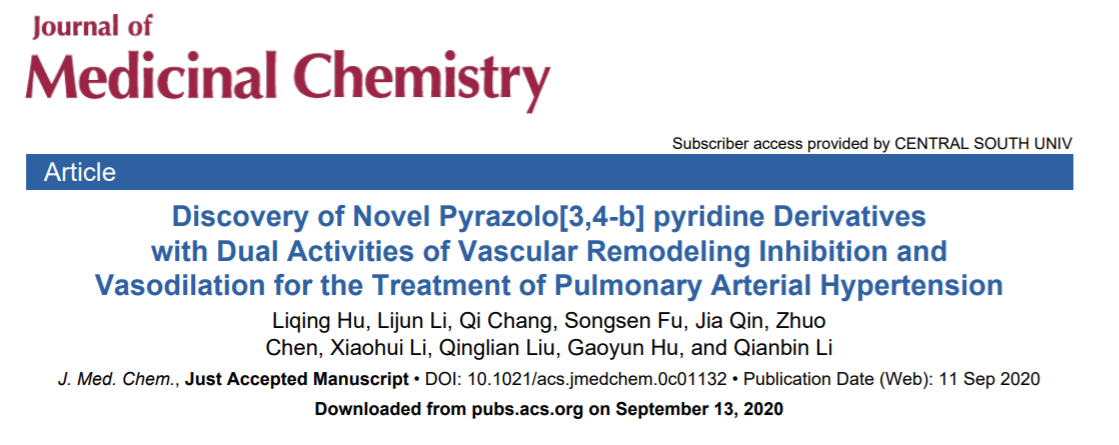 胡高云教授团队以研究论文的形式发表了题为“Discovery of Novel Pyrazolo[3,4-b] pyridine Derivatives with Dual Activities of Vascular Remodeling Inhibition and Vasodilation for the Treatment of Pulmonary Arterial Hypertension.”(doi.org/10.1021/acs.jmedchem.0c01132)的最新研究成果,文章发表在国际药物化学权威期刊《Journal of Medicinal Chemistry》(IF=6.054)。