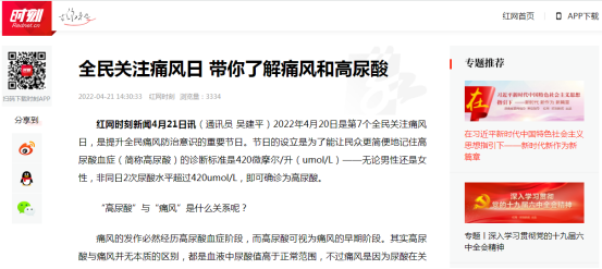 2022年4月20日是第7个全民关注痛风日,是提升全民痛风防治意识的重要节日。节日的设立是为了能让民众更简便地记住高尿酸血症(简称高尿酸)的诊断标准是420微摩尔/升(umol/L)——无论男性还是女性,非同日2次尿酸水平超过420umol/L,即可确诊为高尿酸。
