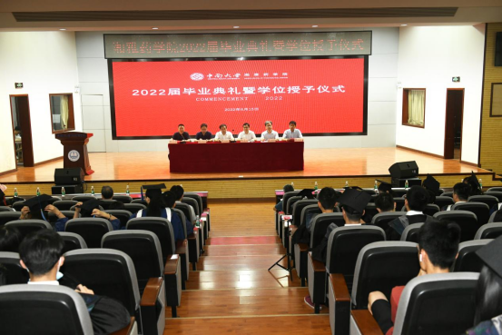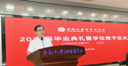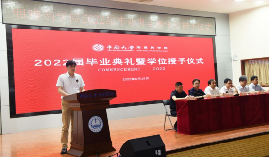 2022届毕业典礼暨学位授予仪式在湘雅新校区图书馆报告厅举行,仪式由学院党委副书记王昊主持。学院党委书记龚涛、刘昭前副院长、曾文彬副院长、胡长平副院长、李乾斌副院长、教师代表艾可龙教授及师生参加了仪式。