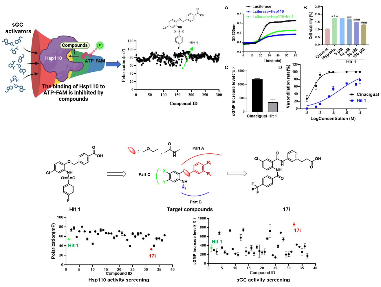 图1 具有Hsp110和sGC双靶点活性的hit 1的筛选、鉴定、结构优化以及17i的发现