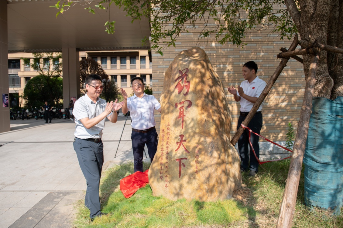 活动首先由2000级本科全体校友向学院捐赠景观石。由阳国平、曹东升、周文虎副院长以及2000级校友代表谭弘毅、曹伟共同为景观石揭幕,校友曹亚杰主持捐赠揭幕仪式。景观石上的“药闻天下”四个字是由周宏灏院士亲笔书写,寓意奈飞工厂