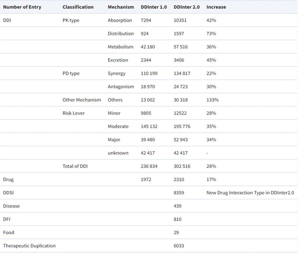 数据覆盖范围的显著扩展是此次更新的核心亮点之一。DDInter 2.0将药物-药物相互作用(DDI)记录从原有的23.6万条大幅增加到30.2万条,涵盖药物数量也从1,972种增至2,310种。这一扩展不仅提高了数据的全面性,还增加了8,398条高质量的机制描述和管理建议,为临床决策提供了更广泛、更深入的参考依据。