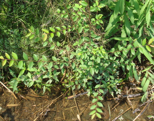 小果蔷薇Rosa cymosa Tratt.【R. microcarpa Lindl.】 蔷薇科蔷薇属。藤状灌木,小枝疏生皮刺,少数无刺。单数羽状复叶,小叶3-5,少数7,边缘为内弯锐的锯齿。两面无毛,背面叶轴有倒钧刺;托叶线形,边缘有腺齿,与叶柄离生,早落。复伞房花序,花多数,花瓣白色。其根:祛风除湿,收敛固脱。用于风湿关节痛,跌打损伤,腹泻,脱肛,子宫脱垂。叶:解毒消肿,用于治痈疖疮疡,烧烫伤。