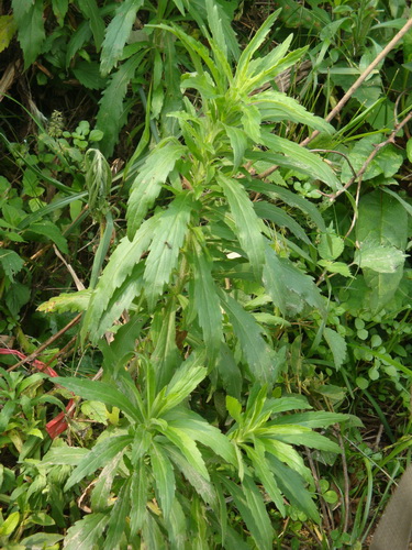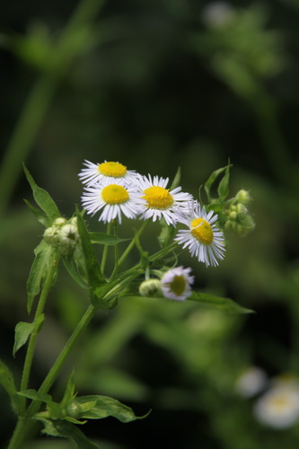 一年蓬Erigeron annuus 菊科飞蓬属。基生叶长圆形或宽卵形,边缘有粗齿,基部渐狭成具翅的叶柄;中部和上部叶较小,长圆状披针形或披针形,边缘有不规则的齿裂,具短叶柄或无叶柄;最上部的叶通常条形,全缘,具睫毛。头状花序排成伞房状或圆锥状;总苞半球形;总苞片3层,革质,密被长的直节毛;舌状花2层,白色或淡蓝色,舌片条形;两性花筒状,黄色。全草入药,有消食止泻;清热解毒;截疟之效,用于消化不良;胃肠炎;齿龈炎;疟疾;毒蛇咬伤。