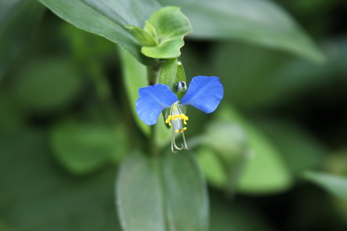 鸭趾草Commelina communis L.别名竹叶草。鸭趾草科春季一年生杂草。茎上部直立或斜伸,圆柱形,下部匍匐生根。叶互生,无柄,披针形至卵状披针形,第一片叶长1.5一2cm,有弧形脉,叶较肥厚,表面有光泽,叶基部下延成鞘,具紫红色条纹,鞘口有缘毛。小花每3—4朵一簇,由一绿色心形折叠苞片包被,着生在小枝顶端或叶腋处。花被6片,外轮3片,较小,膜质,内轮3片,中前方一片白色,后方两片蓝色,鲜艳。全草入药,有清热泻火,解毒,利水之效,用于热病、咽痛、疮疡、毒蛇咬伤、水肿等。