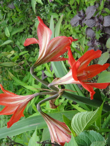 朱顶红Hippeastrum rutilum 又名对红,石蒜科朱顶红属。多年生草本植物,鳞茎肥大,近球形,叶片两侧对生,带状,先端渐尖,2—8枚,叶片多于花后生出,总花梗中空,被有白粉,顶端着花2—6朵,花喇叭形。为观赏植物。