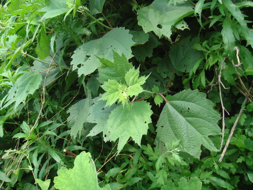 悬铃木叶苎麻Boehmeria tricuspis (Hance) Makino. 又名山麻、方麻、八角麻,荨麻科苎麻属。多年生草本;单叶对生;近圆形或卵圆形,先端3裂,裂片骤尖或尾尖、两侧有数粗牙齿,叶缘为粗重锯齿;基部阔楔形或截形,表面有糙伏毛,背面为短柔毛。花序长穗状,着生于茎上部叶腋处。