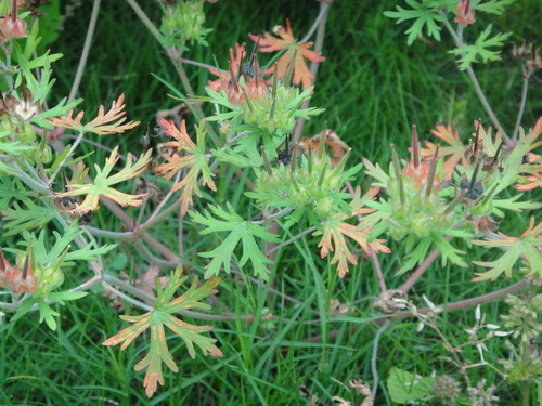 野老鹳草Geranium caroliniamum Linn 牻牛儿苗科老鹳草属。一年生草本,茎直立或斜升,有倒向下的密柔毛,分枝。叶圆肾形,下部的互生,上部的对生,5-7深裂,每裂又3-5裂;小裂片条形,锐尖头,两面有柔毛;下部茎叶有长柄,上部的柄短,等于或短于叶片。花成对集生于茎端或叶腋,花序柄短或几无柄,有腺毛(腺体早落);萼片宽卵形,有长白毛,在果期增大,花瓣淡红色,与萼片等长或略长。蒴果长约2厘米,顶端有长喙,成熟时裂开,5果瓣向上卷曲。全草入药,可治风湿病。