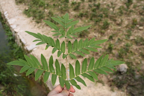 盐肤木Rhus chinensis Mill 又名五倍子树,漆树科盐肤木属。落叶乔木,树皮灰褐色,有赤褐色斑点;小枝上有三角形叶痕。叶互生 ,奇数羽状复叶,总叶柄基部膨大,叶轴有灰褐色细毛,叶翅具关节。小叶7~13枚,无柄,顶部小叶基部圆形而渐尖,先端急尖,侧方小叶,除基部外,边缘有波状钝齿,表面有疏毛,背面密生绒毛,羽状脉10~17对,幼芽或叶柄常受五倍子虫的刺伤而生成囊状的虫瘿,似茶泡状,称为"五倍子"。