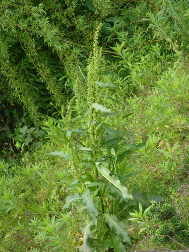 羊蹄Rumex japonicus Houtt. 蓼科酸模属。多年生草本,根粗大,断面黄色。茎直立,通常不分枝。单叶互生,具柄;叶片长圆形至长圆状披针形,基生叶较大先端急尖,基部圆形至微心形,边缘微状波皱褶。总状花序顶生,每节花簇略下垂;花两性,花被片6,淡绿色,外轮3片展开,内轮3片成果被。根入药,有清热解毒,止血,通便,杀虫之效,用于鼻出血,吐血衄血,肠风便血,痔血,崩漏功能性子宫出血,血小板减少性紫癜,慢性肝炎,肛门周围炎,大便秘结;外用治外痔,急性乳腺炎,黄水疮,疥癣,白秃,痈疮肿毒,跌打损伤。
