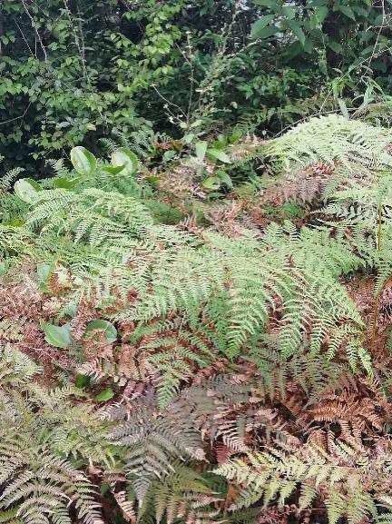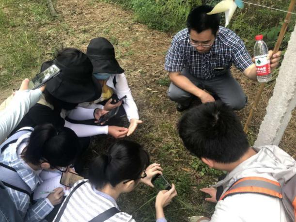 领着我们一步一个脚印向山顶走去。上山的小路越来越陡,身旁植被的高度也从膝盖处长到了头顶,李老师挥动着长木棍,打着路旁的植物叶子,意为打草惊蛇,让我们免于陷入被蛇咬伤的危险之中。在爬山过程中,老师时不时指着某种植物让我们猜测,紫萁贯众、铁芒萁、毛轴蕨就这样进入到我们的视线中。