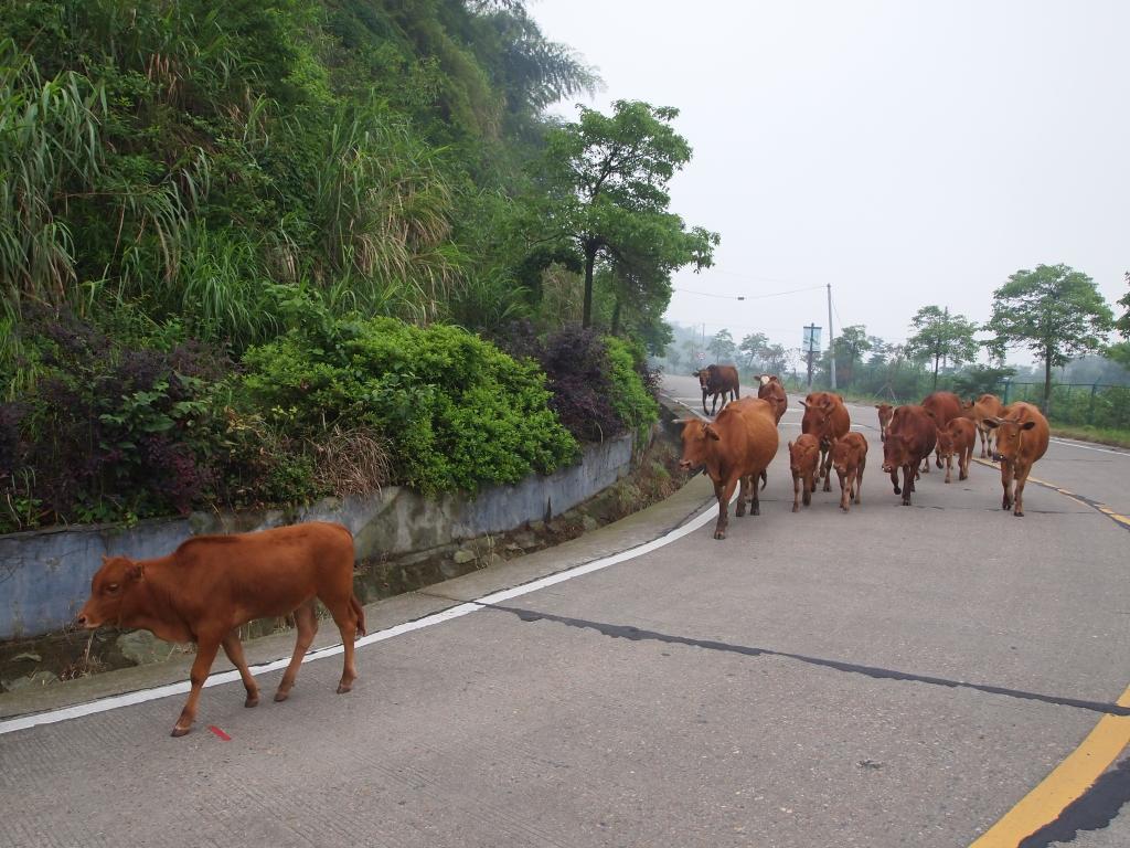 坐在车上一路摇摇晃晃,约莫个把小时,到了黑麋峰。下车处正对水库,四周是连绵山峰,真是好山好水好地方。马路上还有牛群悠悠地走着,脖子上的牛铃铛铛地响,不由长叹一声,好一片田园风光。