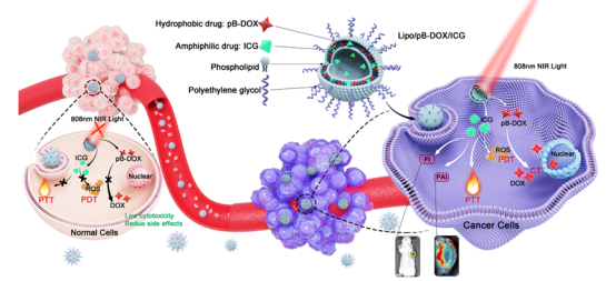 为实现药物的精准释放与可控激活,程泽能教授团队设计了一种多柔比星前药pB-DOX,进一步将pB-DOX与光敏剂ICG共载于纳米脂质体,通过ICG的荧光成像和光声成像性能监测纳米脂质体在肿瘤部位的蓄积。给予808 nm的近红外光照射后,ICG生成的活性氧(ROS)发挥PDT作用;同时,ROS触发pB-DOX的ROS敏感键断裂,发挥化疗作用。该纳米药物在体循环和非肿瘤组织中低毒,在靶点按需释药以实现化疗和PDT的协同治疗,为智能响应药物递送系统向临床转化提供了新思路。该论文以“ROS-responsive liposomes with NIR light-triggered doxorubicin release for combinatorial therapy of breast cancer”为题发表于《Journal of Nanobiotechnology》杂志,论文第一作者为2017级博士研究生易汉希,该研究得到国家自然科学基金资助。