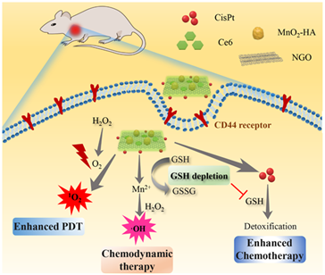 与此同时,丁劲松-周文虎教授团队构建了一种复合型的MnO2缀合氧化石墨烯片状纳米体系共递送光敏剂Chlorin e6及化疗药物顺铂,并修饰透明质酸(HA)作为稳定剂及靶向配体。在该复合体系中,MnO2催化产氧及消耗内源性谷胱甘肽;还原产物Mn2+通过芬顿效应发挥化学动力学治疗作用;该工作展现出肿瘤微环境调控型纳米递药体系用于联合治疗的巨大潜力,为设计多功能纳米递药系统用于增强型化疗-光动力联合治疗提供了一种新的思路。本论文以“A Smart MnO2 Doped Graphene Oxide Nanosheet for Enhanced Chemo-Photodynamic Combinatorial Therapy via Simultaneous Oxygenation and Glutathione”为题发表于国产卓越期刊《Acta Pharmaceutica Sinica B》上。论文第一作者为2018级博士研究生刘鹏,该研究得到奈飞工厂
