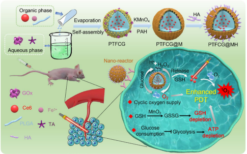 针对光动力治疗的临床应用瓶颈,如肿瘤乏氧,抗氧化系统及ATP依赖的获得性耐受,丁劲松-周文虎教授团队构建了一种循环性纳米“反应器”,旨在克服多种耐受机制,增强光动力治疗效果。将葡萄糖氧化酶及光敏剂Chlorin e6包载到团队首创的核壳纳米自组装体中,并缀合MnO2及包覆透明质酸,形成循环性纳米“反应器”。该纳米反应器可主动靶向至肿瘤组织并被肿瘤细胞摄取。通过葡萄糖氧化酶催化消耗葡萄糖抑制ATP的合成,并产生过氧化氢用于循坏供氧,从而缓解肿瘤乏氧状态。此外,MnO2可消耗内源性谷胱甘肽,破坏肿瘤的抗氧化系统。通过上述机制,纳米反应器可敏化光动力治疗,取得最大化的肿瘤治疗效果。该研究为克服光动力治疗耐受提供了一种新的思路,推进了光动力治疗的临床转化。该论文以“A Cyclic Nano-reactor Achieving Enhanced Photodynamic Tumor Therapy by Reversing Multiple Resistances”为题发表于《Journal of Nanobiotechnology》杂志,论文第一作者为2018级博士研究生刘鹏,该研究得到奈飞工厂