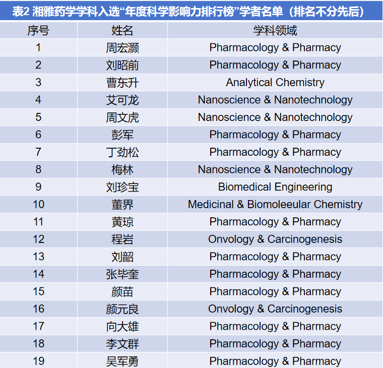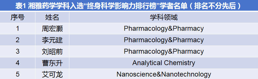 该榜单分为“终身科学影响力排行榜(Career-long Impact)”和“年度科学影响力排行榜(Single-year Impact)”两部分,其中,“终身影响力”体现职业生涯整体学术贡献,“年度影响力”则聚焦上一年度的学术表现,湘雅药学学科分别有5人和19人入选(详见下表)。